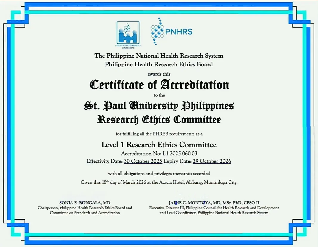 St. Paul University Philippines (SPUP), through its Research Ethics Committee (SPUP REC), proudly affirms its commitment to upholding the highest standards of ethical review and protection of research participants. For the term October 30, 2025 to October 29, 2026, the SPUP REC continues to serve as the University’s institutional mechanism that ensures research protocols are reviewed with integrity, competence, and strict adherence to established ethical guidelines, under the leadership of Chair, Ms. Rita Daliwag, together with its dedicated committee members and support staff.